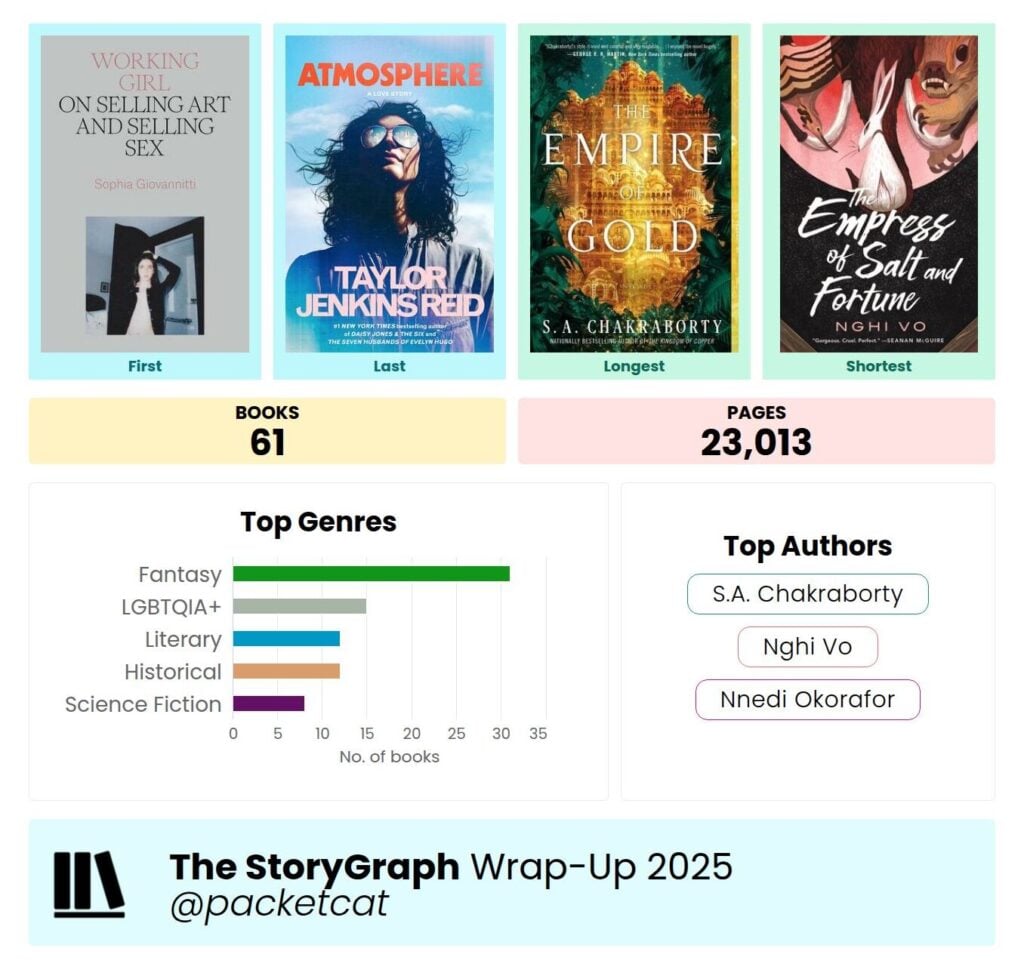 So let’s talk some fun numbers. All of my book reading this year was tracked within Storygraph and as such all statistics regarding said reading come from there.