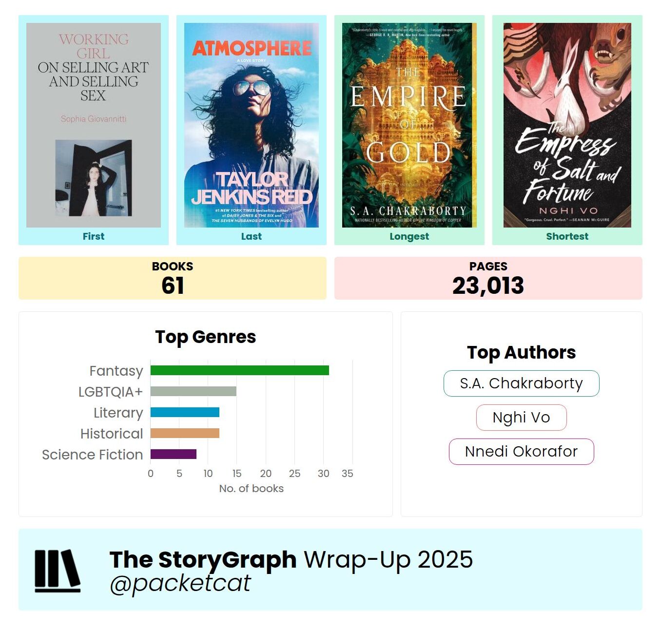 I read 61 books with an average time to finish of 2 days. 80% (49 books) were fiction titles, the remaining 20% nonfiction (12). Compared to 2024, I read a lot more books and blew way past my reading goal of 52 books a couple months ago. Turns out there is not much else to do in the hot summer months when I’m not interesting in gaming. So I read a lot.
